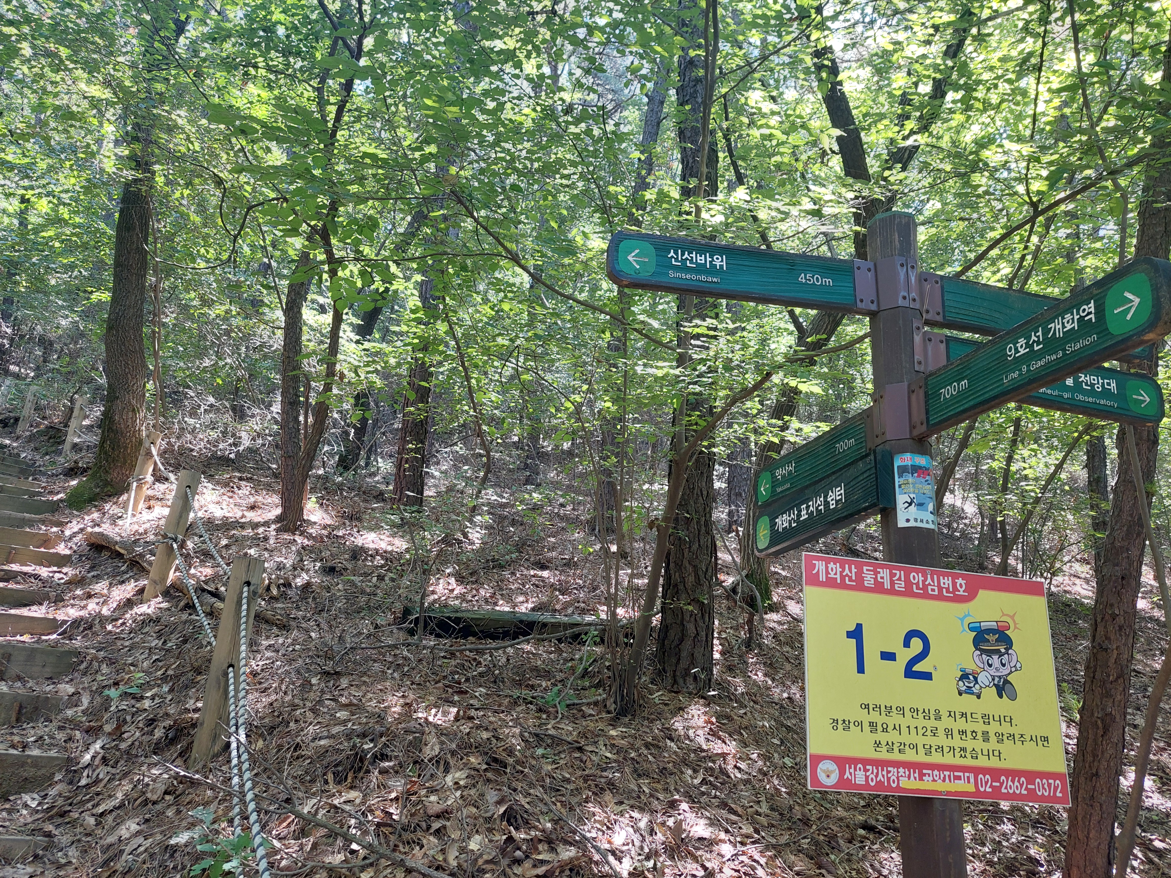 산행코스 : 5호선 개화산역 2번출구 > 개화산 자락길방향 > 북카페쉼터 > 봉수대 > 아라배길 전망대 > 신선바위 > 정상 > 하늘길 전망대 > 강서둘레길 2코스 > 방화근린공원 > 치현산 > 방화역