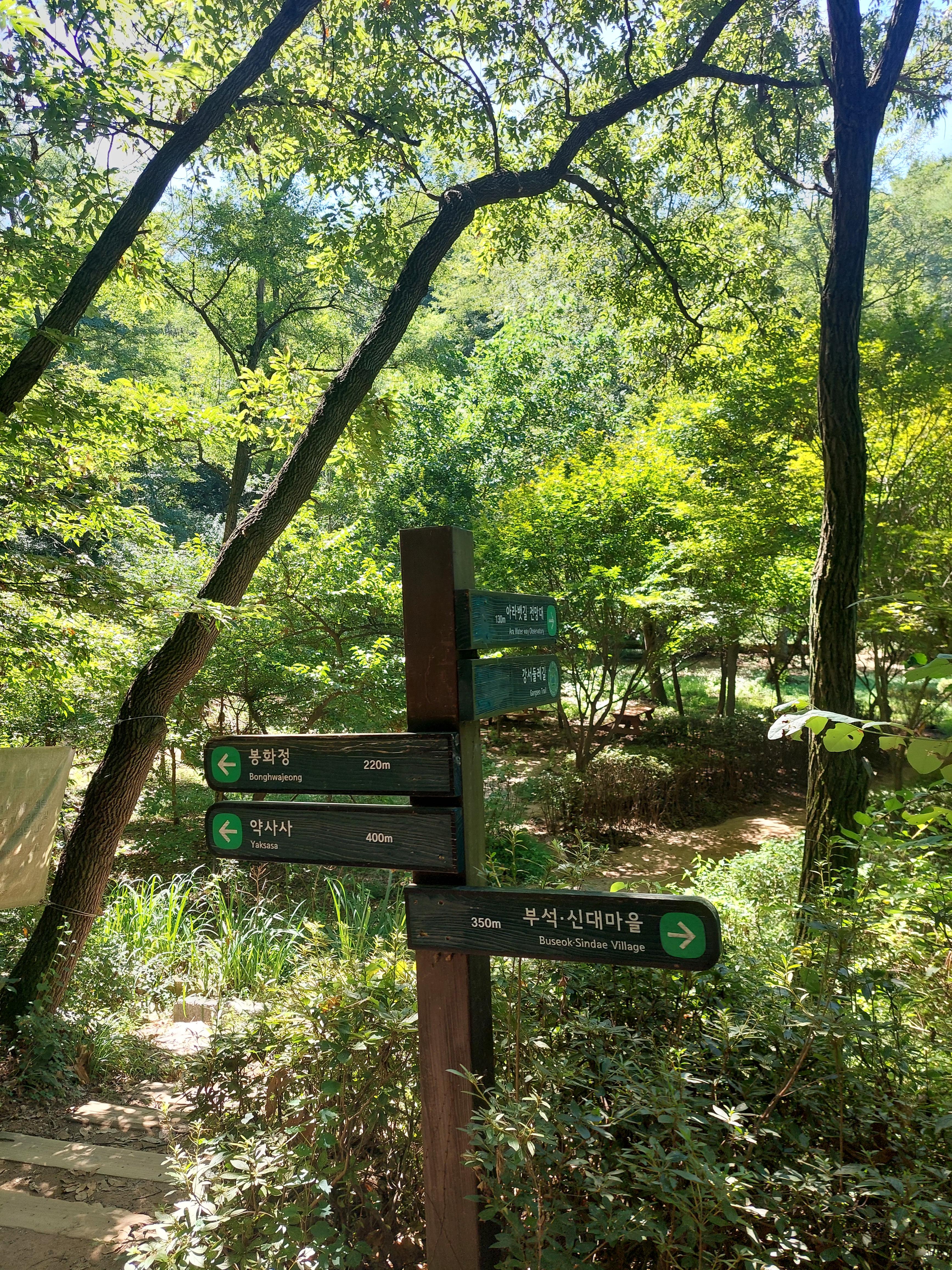 초등학교 끝나는 지점에서 사진상 이정표에서 무장애 숲길방향 왼쪽으로 들어간다
